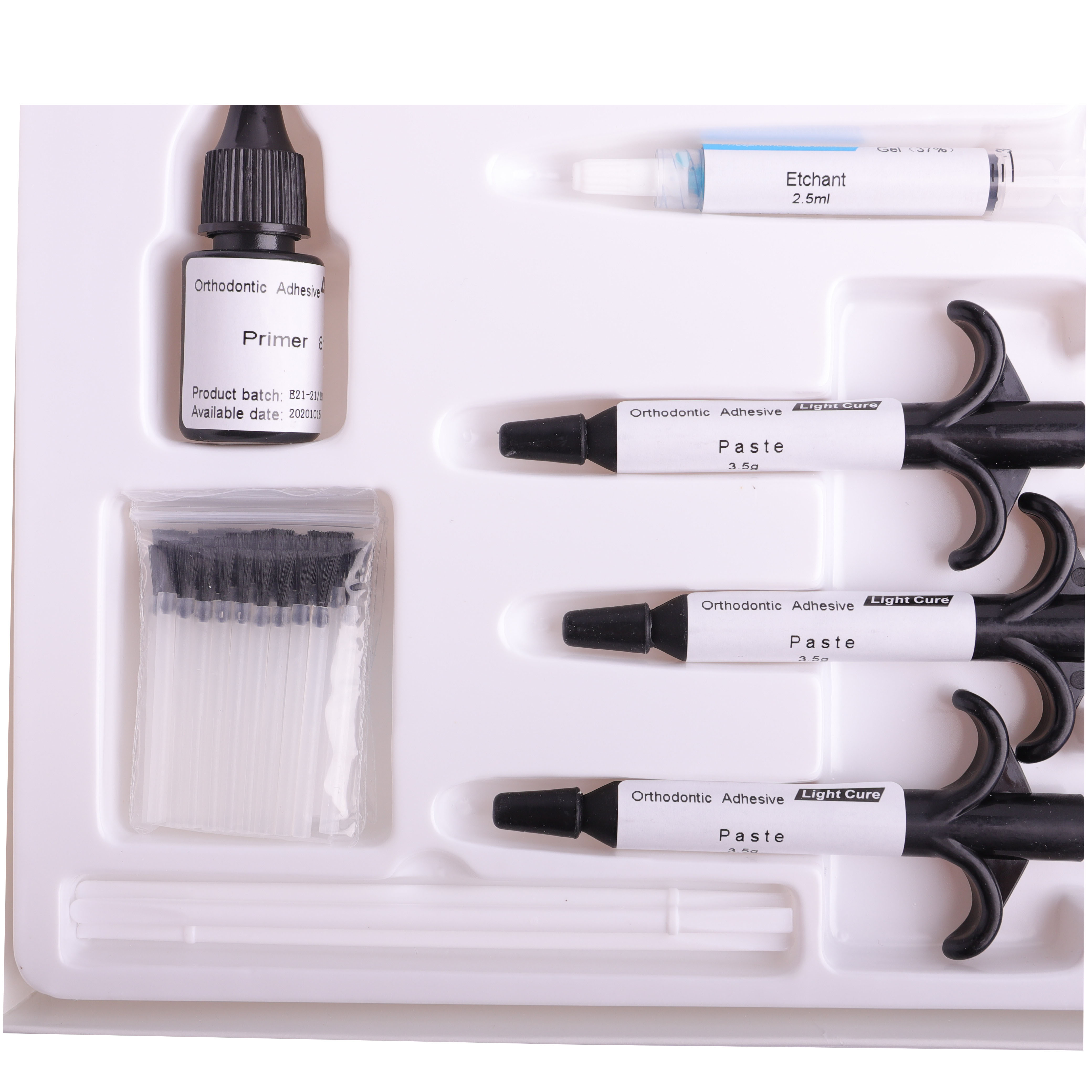 3 x 3.5gm Syringe Paste 1 x 10ml Primer 1x 3 gm Gel Etchant 20 Bonding Brushes 2 Double Ended Mixing Spatulas